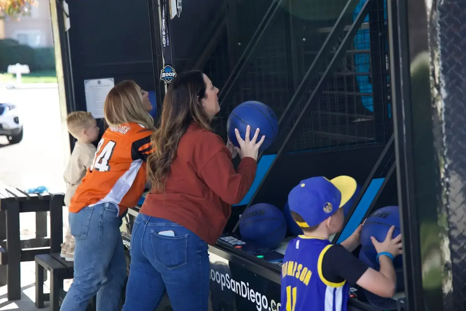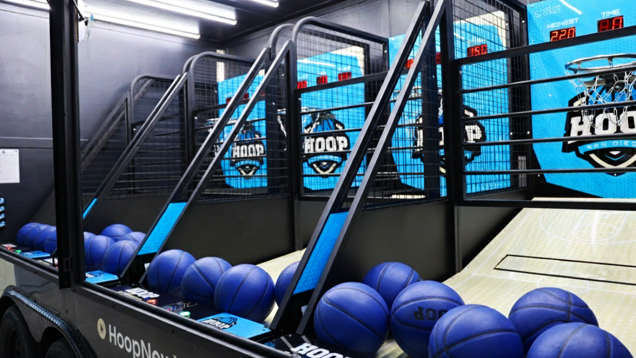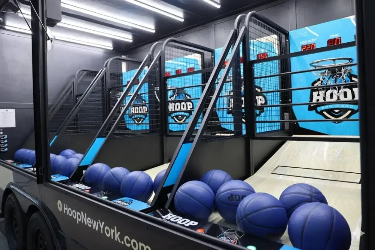 Four hoops, LED scoreboards, music, and disco lights keep the energy from first shot to last.